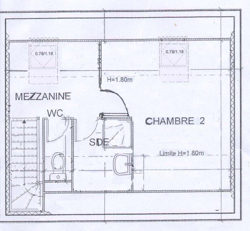 Etage : Chambre avec armoire, chevets, 2 lits 1 personne et lit bébé. Mézanine avec bureau et chaise. WC. Salle d'eau avec douche, lavabo et lave-linge.